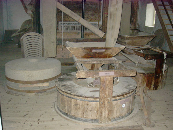 This is the second, or stone, floor. An uncovered pair of millstones is seen on the left, separated by a piece of wood so you can see the furrows in the bed stone. A complete, cased stone is in the foreground. Grain enters the hole in the middle of the upper stone (runner, or moving stone) from bins on the third floor, and meal comes out at the outer edge of the stones into the case, from which it falls into the chute to the first floor (meal floor), where it is bagged.