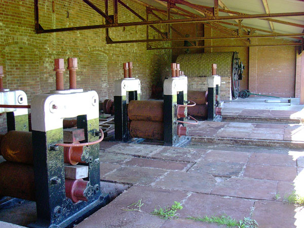 Kidwelly has many roller mills like these, through which plates of iron or steel were passed. If the plates had been heated, the mill would reduce their thickness. Cold milling would correct uneveness and burnish the surface. In this cold mill, the power was supplied by shafts through the brick wall on the left. The boiler in the background provided steam to the engine behind the wall. All this shiny paint is new; when conservation of Kidwelly began the site was a shambles, and the process of conservation is far from complete. Kidwelly is a work in progress.