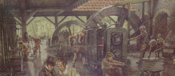 This figure, which I photographed at Aberdulais Falls, shows a hot milling operation that probably closely resembled the process at Kidwelly, except that Aberdulais was water powered, whereas Kidwelly was steam powered. Note the flywheel in the background, the furnaces on the left, the rollerman on the left, the behindman on the right, and several children working in the mill.