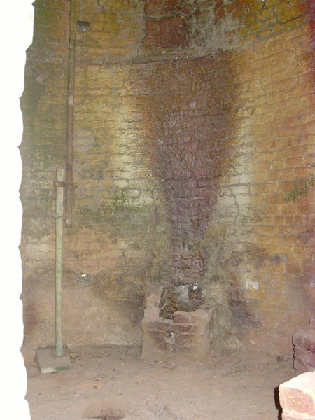 The interior of the kiln shows the mark made by the flame from the fire box in the floor.