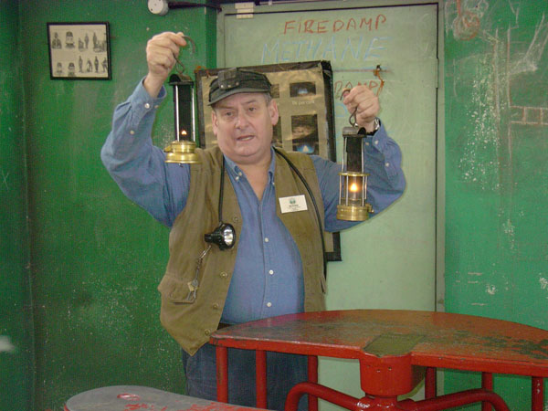 The guides at Rhondda Heritage Park are former miners. Our guide is showing us two different lamps, both designed to burn without igniting methane gas that might be present in the mine. The hot gas coming off the flame is cooled by passing through the black metal mesh, so that it is too cool to ignite the methane in the mine. The lamp on the right lets more light out, since the light passes through clear glass instead of being partially blocked by the mesh.
